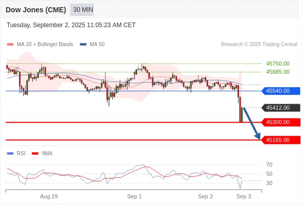 DOWJONES (US30) (CME) تداول يومي: الاتجاه العام هابط