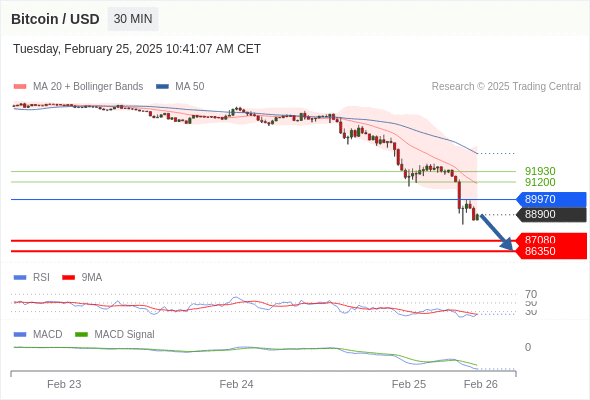كسر الدعم 87080والثبات أدنى منه على الأقل بشمعة 4 ساعات ستدفع السعر نحو الدعم التالي 86350