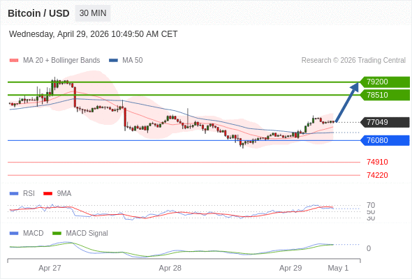 كسر المقاومة 78510 والثبات أعلى منها على الأقل بشمعة 4 ساعات ستدفع السعر نحو المقاومة التالية