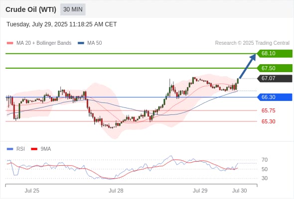 كسر المقاومة. 67.50والثبات أعلى منها على الأقل بشمعة 4 ساعات ستدفع السعر نحو المقاومة التالية 68.10