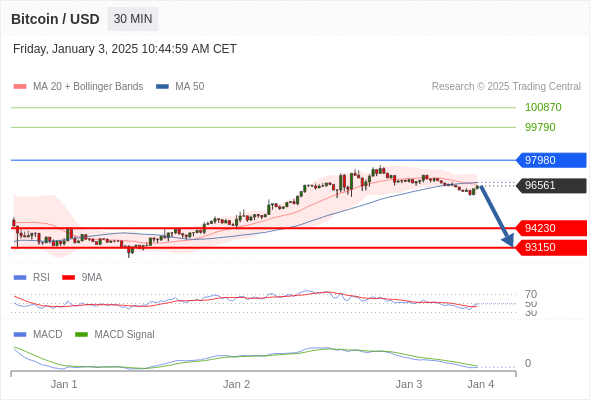 كسر الدعم 94230والثبات أدنى منه على الأقل بشمعة 4 ساعات ستدفع السعر نحو الدعم التالي 93150