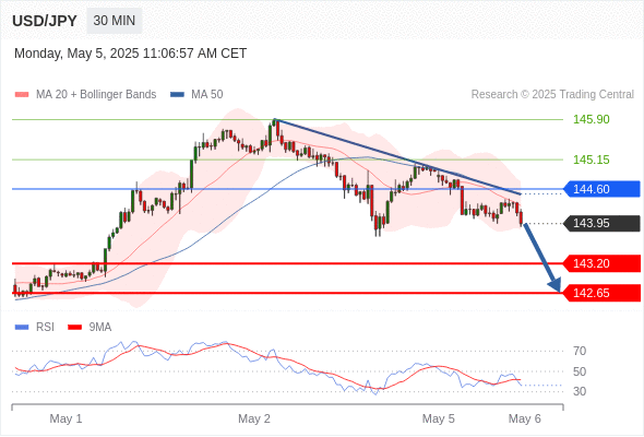 كسر الدعم 143.20والثبات أدنى منه على الأقل بشمعة 4 ساعات سيدفع السعر نحو الدعم التالي 142.65