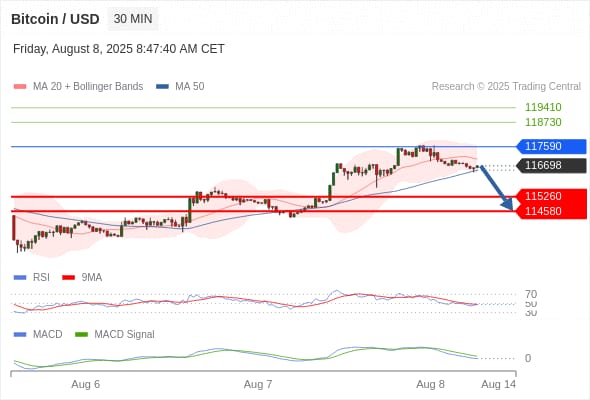كسر الدعم 115260والثبات أدنى منه على الأقل بشمعة 4 ساعات ستدفع السعر نحو الدعم التالية 114580